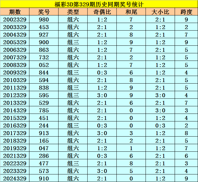 福彩3D历年第329期同期奖号为:980 453 927 900 863 732 052 844 594 838 595 529 785 451 244 913 165 047 286 477 573 910。