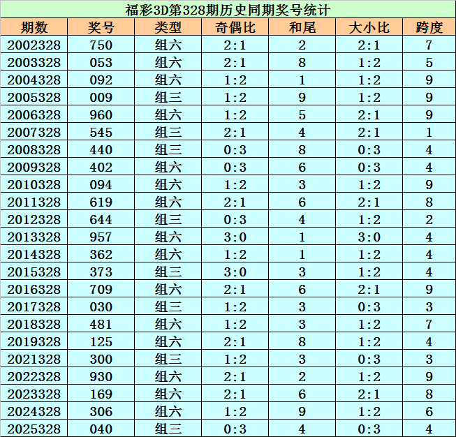 福彩3D历年第328期同期奖号为:750 053 092 009 960 545 440 402 094 619 644 957 362 373 709 030 481 125 300 930 169 306 040。